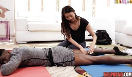 Вот все привыкли, что если жесткое межрасовое порно, то там негр с просто таки громадным половым прибором страстно жарит грудастую белую матрону или наоборот. Но вот здесь азиатская специалистка по йоге Шэрон Ли приходит к черному парню, чтобы научить его уму-разуму, но по факту гоняет мужскую шнягу между довольно таки внушительных буферов, плавно переходя к межрасовому перепихону по типу азиаты с чернокожими.