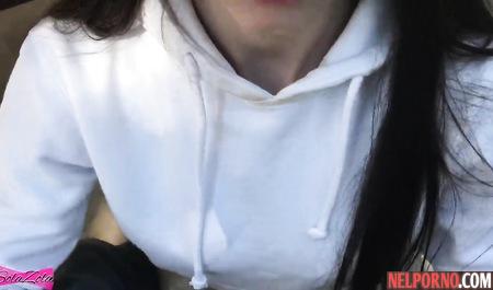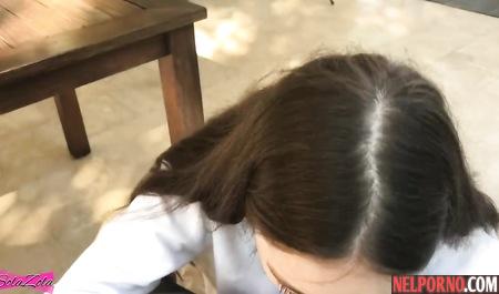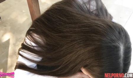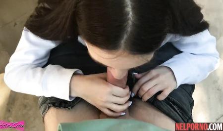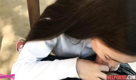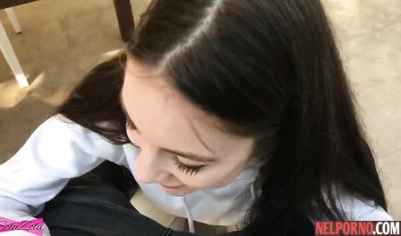 Длинноволосая брюнетка на коленках делает минет парню на камеру