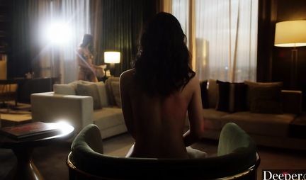 Две брюнетки устроили для бизнесмена на диване групповой секс