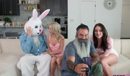 Если долго нет секса, то включается воображение. Примерно так и происходит у симпатичного пасынка. Именно поэтому он украл у парня аниматора костюм кролика, чтобы трахнуть приемную сестру, но мачехе тоже хочется, один батя не при делах. Ну так паренек трахается за троих и большим членом в полной мере удовлетворяет как чернявую сестрицу, так и свою мачеху. Хорошо хоть на папашку пока не поглядывает!