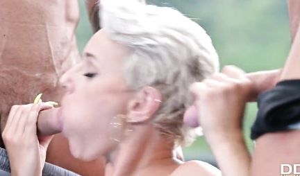 Групповушка с обалденной милфой и страстным ДП освобождает яйца качков от спермы
