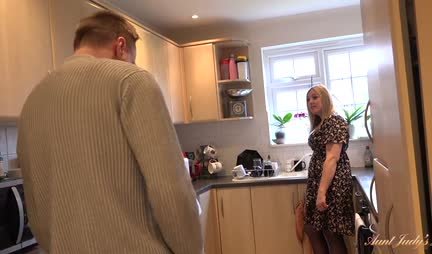 Парень-студент чисто случайно заглянул к зрелой соседке-милфе, которая частенько приглашала того навестить ее скромное жилище. Вот только предложение было определенно не просто так, а потому зрелая блондинка в срочном порядке пососала член на кухне, а после и подставила шмоньку под молодой член прямо на мойке. В итоге потыкать соседку в разных позах, дружок сливает сперму блондинке на сиси и даже обещает завтра забежать еще раз!
