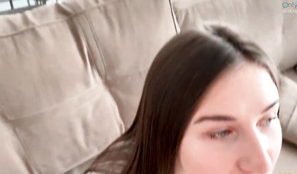 Молоденькая девушка в позе раком прогибается у дивана для домашнего секса