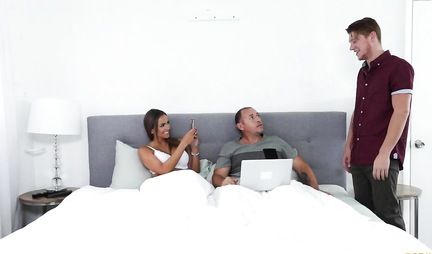 Мужик прямо в спальне не обращает внимания на измену своей молодой жены