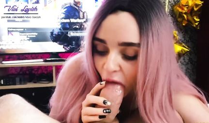 Мужик снял крупным планом, как красотка с фиолетовыми волосами пыталась сосать его огромный фаллос