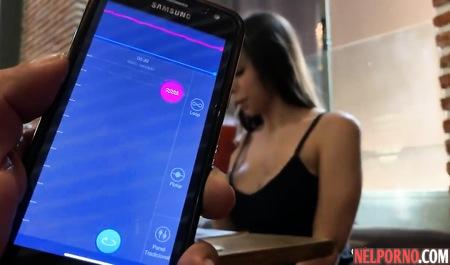 Парень при помощи мобильного приложения доводит девушку до оргазма прямо на публике