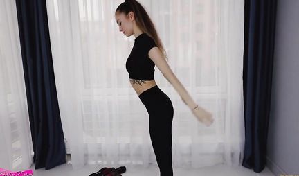 Русская фитоняша сняла черные лосины и на четвереньках дала парню в пизду