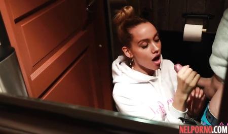 Русская молодая жена порадовала мужа дрочкой и глубоким минетом в туалете кафе
