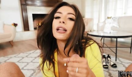 Шикарная брюнетка с классной задницей ножками дрочит член